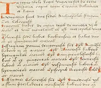 János Barta and Gábor Barta argued both the real size and the internal proportion of the king's considerable incomes are more than doubtful.[14] The two historians compared it with the annual incomes of later kings (again using the pure silver as a common unit of measure), and according to this, only Matthias Corvinus approached the amounts found in Béla's income register 300 years later, in the 1480s (with annual 703,000 golden florins, an equivalent to 27,775 kg of pure silver), which casts doubt on the authenticity of the Béla-era figures. They argued the amount of Béla's income from the compulsory annual exchange of coins (11,201 kg of pure silver) assumes a surreal scale in annual production of precious metals (35,000 kg silver yearly), thus the amount is completely uncredited, or the data does not only contain the numbers for the mandatory coin exchange (the so-called "chamber's profit"), but also revenues from coinage, silver mining (in Selmec and Radna) and gold mining.[16] Béla's amount from salt mining and trade point again only to the fact that it was reckoned about 25 percent more to the reality in the age of his reign, after analyzing the increase in the population of Hungary and the parallel increase in the demand for salt and production costs in the upcoming centuries (during the rule of Sigismund then Matthias).[17] Béla's significant income from the royal estates (60,000 marks) shows that at that time the monarch was still the largest landowner in the country, owning more estates than all the nobles combined (two-thirds part of the entire kingdom). He also maintained the taxation of royal estates that fell into private hands. The disintegration of the royal landholding system took place in the 13th century, during the reigns of Andrew II and Béla IV.[18] The high amount of tax from hospes (guest) communities from Transylvania (15,000 marks) reflects that this category did not only include Transylvanian Saxons, but other ethnic groups (e.g. Székelys, Walloons, Pechenegs and Vlachs).[18] Even with this, the overcounting can therefore be at least doubled, or even greater, if the Székelys, for instance, cannot be classified among the "foreign" peoples paying tribute to the king.[19]