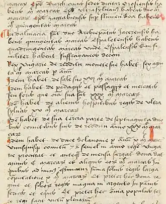 According to the earliest opinions (for instance, Ferenc Baumgarten), the above account was made for the purpose of papal tax collection for the Roman Curia. The document lists the revenues of the two archbishops and their suffragans, in addition to mentioning that Esztergom had its own mintage and data also refer to the two Dalmatian archdioceses, which at that time had a total of ten suffragan bishoprics, but their names and income are not detailed in the list.[4]