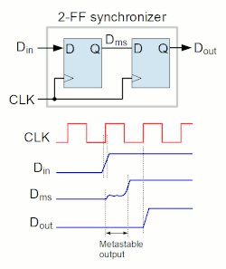 Typically this synchronization is performed by independent, single-signal synchronizers such as the two flip-flop synchronizer seen here. At very high clock frequencies, or when a very low error rate is needed, the synchronizers may include additional flip-flops in order to achieve an acceptably low bit error rate.[10]