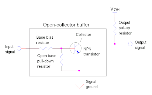 Because it cannot source current, the output of an open-collector driver must be connected to a positive DC voltage through a pull-up resistor. Some encoders provide an internal resistor for this purpose; others do not and thus require an external pull-up resistor. In the latter case, the resistor typically is located near the encoder interface to improve noise immunity.