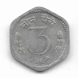 The Indian Three paise (Hindi: तीन पैसे) (singular: Paisa), is a former denomination of the Indian Rupee. The 3 coin equals 3⁄100 of the Indian Rupee. The symbol for paisa is (