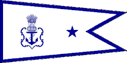 A white triangular pennant with a gold-bordered octagon enclosing the crest of the Indian Navy in the hoist.