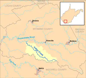 Indian Creek is a tributary of the Guyandotte River, 19.7 miles (31.7 km) long,[3] in southern West Virginia in the United States. Via the Guyandotte and Ohio rivers, it is part of the watershed of the Mississippi River, draining an area of 43 square miles (110 km2)[4] in a rural area on the unglaciated portion of the Allegheny Plateau.