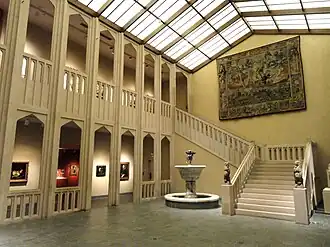 From the 1930s until the 1950s, the John Herron Art Institute placed an emphasis on professionalism and growth in collections.[3] Wilbur Peat, director of the museum from 1929 until 1965, acquired significant portions of the collection. Peat also made connections with benefactors such as George H. A. Clowes, Booth Tarkington, and Eli Lilly. Caroline Marmon Fesler, president of the Art Association of Indianapolis, gave a number of artworks in the 1940s, including 20th-century modern artworks and Post-Impressionist works by Cézanne, Van Gogh, and Seurat.[3] After years of debate surrounding expansion and relocation of the museum and school, the great-grandchildren of Eli Lilly, J.K. Lilly III and Ruth Lilly, donated the family estate, Oldfields, to the Art Association of Indianapolis in 1966. One year later the Art Association decided that the Herron Art School would be ceded to Indiana University's Indianapolis campus in an effort to assist with accreditation. That same year the Association confirmed that the museum would relocate to Oldfields, with the new Krannert Pavilion opening to the public in October 1970.[15][16] In 1969, prior to moving to the new site, the Art Association of Indianapolis officially changed its name to the Indianapolis Museum of Art.[3][17]