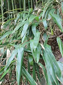 Indocalamus tessellatus, the large-leaved bamboo, is a species of flowering plant in the grass family Poaceae, native to China. A medium-sized, hardy evergreen bamboo growing to 2 m (6.6 ft), it forms a clump of broad leaves 60 cm (24 in) long and up to 10 cm (3.9 in) wide – the broadest of any bamboo – which cause the slender cane to bend under their weight. Though hardy down to −15 °C (5 °F) and able to survive conditions in most of the UK, it prefers a sheltered site in semi-shade with moist, rich soil. Given the best conditions possible, it will eventually form large thickets or groves, but can be kept in a large container.[3] In cultivation in the UK it has gained the Royal Horticultural Society's Award of Garden Merit.[4][5]