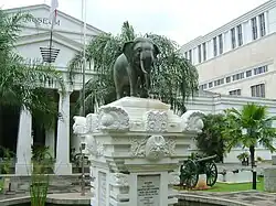 During colonial Dutch East Indies era, the cordial relations continued. King Rama V (King Chulalongkorn), reign 1868–1910, visited Java three times, in 1870, 1896 and 1901.[10] The Thai king visited Batavia, Bandung, and Semarang, also visited Borobudur. The king brought a bronze elephant statue as a souvenir. The elephant currently stands in front of the National Museum in Jakarta. The king was keen and interested on ancient Java history, art and culture. In an instance he expressed his wish on collecting some examples of ancient Javanese archaeological relics, as the response the Governor General of Dutch East Indies sent him the gift of eight carts load of statues and stone carvings taken from Borobudur. These include 30 pieces taken from a number of relief panels, five buddha images, two lions, one gargoyle, several kala motifs from the stairs and gateways, and a large guardian statue (dvarapala). Several of these artifacts, most notably the lions and dvarapala are now on display in The National Museum in Bangkok.[11]