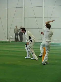 The game of indoor cricket can be played in any suitably sized multi-purpose sports hall. There is evidence of the game being played in the 1920s and 1930s.[1] Furthermore, it was played in the 1960s as a means of giving amateur and professional cricketers a means of playing their sport during the winter months. The first recorded organised indoor cricket league in the world took place in 1970 in North Shropshire,[2] and the first national tournament was completed in 1976 with over 400 clubs taking part. By 1979 over 1000 clubs were taking part in indoor cricket in the UK, and it remains extremely popular today with many leagues around the country.[3] Other forms of indoor cricket have been developed, based on variations of the indoor game.[4]