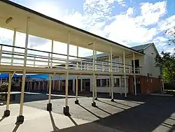 From the early 1950s the Department of Public Instruction introduced and developed new standard plans for school buildings, which were similar in form and layout to the Boulton & Paul buildings but not prefabricated: long, narrow, timber-framed buildings with a gable roof, north facing verandah with posts that extended from ground level to roof line, semi-enclosed stairs, and extensive areas of glazing to the verandah and southern classroom walls.[49] This type was the most commonly constructed in the 1950s in Queensland.[50][1]