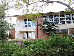 A second stage of Block C and landscaping works were constructed in late 1955. A 24-by-44-foot (7.3 by 13.4 m) classroom, designated as a drawing room, was constructed between blocks A and C at their western ends, forming a link between them. Orientated approximately north–south, this addition (known as Building A6 as of 2025) had a shallow gable roof, extensive glazing along the eastern wall of the upper floor, and high-level windows along the western wall. The ground floor was open play area with bike racks at either end and access to a bicycle storage room under the western end of Block C. Supported mainly on round concrete columns and brick end walls, an opening in the western wall had a special feature - lozenge-shaped concrete columns that supported four large "round the corner" doors, that allowed the underfloor area to be sealed off from westerly winds (doors now removed).[67][68][69][64][65][66][1]