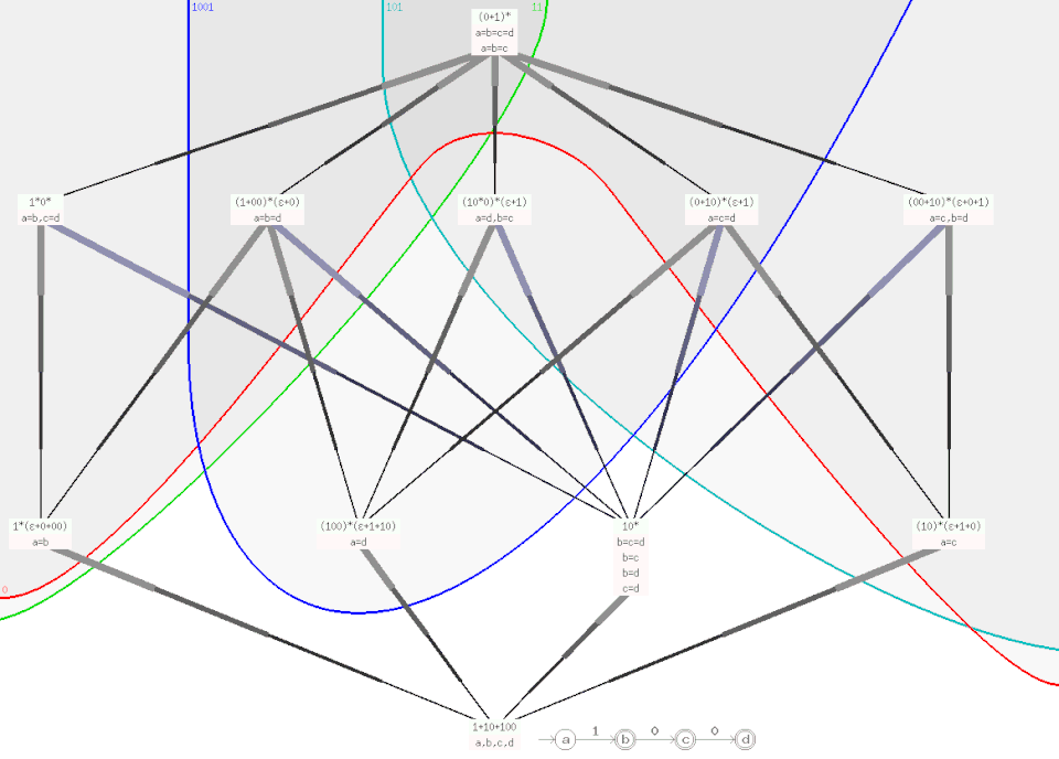 For the above example string set {1, 10, 100}, the picture shows at its bottom the undergeneralized automaton Aa,b,c,d in grey, consisting of states a, b, c, and d. On the state set {a,b,c,d}, a total of 15 equivalence relations exist, forming a lattice. Mapping[note 2] each equivalence E to the corresponding quotient automaton language L(Aa,b,c,d / E) obtains the partially ordered set shown in the picture. Each node's language is denoted by a regular expression. The language may be recognized by quotient automata w.r.t. different equivalence relations, all of which are shown below the node. An arrow between two nodes indicates that the lower node's language is a proper subset of the higher node's.
