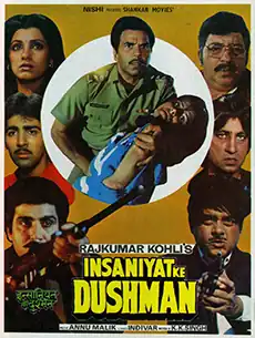 Insaniyat Ke Dushman (transl. Enemies of Humanity) is a 1987 Hindi-language action drama film directed by Rajkumar Kohli. The film features an ensemble cast of Dharmendra, Shatrughan Sinha, Raj Babbar, Sumeet Saigal, Dimple Kapadia, Anita Raj, Amjad Khan, Shakti Kapoor, Kader Khan, Aruna Irani, along with Smita Patil in a special appearance. The film revolves around a young lawyer seeking revenge against the perpetrators who raped his sister and drove her to suicide. It also contains a subplot revolving around an honest cop and his brother, and how the need for wealth drives them apart and leads to a situation where the cop is forced to arrest his own brother.