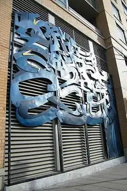 This metal sculpture is placed on an air intake vent on the facade of the CityVista building just north of Busboys and Poets. At 25 feet by 25 feet; it consists of five panels which are made up of 80 custom CNC plasma cut metal sheets.[2] It weighs about 3,500 pounds. Painted in shades of blue, the design represents exhaled breath on a cold day.[1]