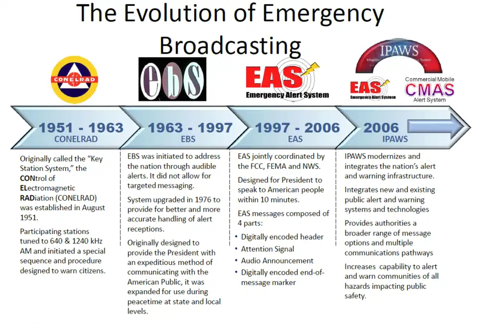 In June 2006, following criticism over the government's response to Hurricane Katrina, President George W. Bush signed Executive Order 13407[2] ordering the Secretary of Homeland Security to establish a new program to integrate and modernize the nation's existing population warning systems. These systems include the: