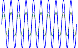 The sum (blue) of two sine waves (red, green) is shown as one of the waves increases in frequency. The two waves are initially identical, then the frequency of the green wave is gradually increased by 25%. Constructive and destructive interference can be seen.
