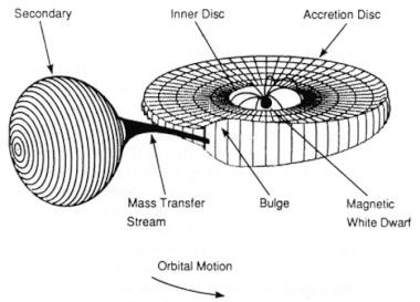 In intermediate polar systems, material stripped from a red dwarf secondary star flows into an accretion disk around the white dwarf, but the inner disk is truncated by the magnetic field of the white dwarf. In extreme instances, the disk can be fully disrupted, although this is uncommon.[2] In the region where the disk is truncated, the gas in the disk begins to travel along the white dwarf's magnetic field lines, forming curved sheets of luminous material called accretion curtains.[3] Disk material passes through the curtains and then accretes onto the white dwarf near one of its magnetic poles.