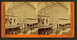 Construction of a new International Hotel began in May 1876, on the same site as the original buildings.[2] The hotel project, modeled after the Palace Hotel in San Francisco, was financed by owners Albert Hanak and Ike Bateman.[4] The six-story hotel stood 109 feet (33 m) high,[1] and was built at a cost of $600,000.[5] It opened as the tallest building in the state[6] on the night of March 31, 1877.[2][5] Attendees at the grand opening included businessmen James Graham Fair and John William Mackay, as well as U.S. Senator William Sharon and politician John Henry Kinkead.[5]