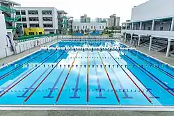 The Ampang campus, which began use from August 2018, is set on approximately 10 hectares (25.7 acres) in Ampang Hilir.[26] The campus has facilities catering to both athletics and the arts. Athletic facilities include: an indoor fitness center, an Olympic-sized track; three sports fields; an Aquatic Complex including a 50-metre Olympic-sized swimming pool built accredited by FINA,[27] two gyms, an indoor climbing wall, tennis courts and playgrounds.[28][29] Arts facilities include The Dr. Norma J. Hudson Amphitheater, the Robert B. Gaw Theater and the Melawati Theater: available for student meetings, music recitals, presentations, plays and other arts-centric performances;[30][31] ISKL's 'green' facility is the first International school in Malaysia to achieve platinum Green Building Index (GBI) status with environmentally sustainable concepts.[32][33]