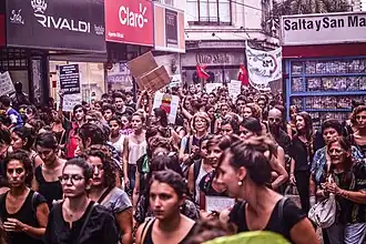 19 October 2016, saw the #NiUnaMenos protest against femicide in Argentina, a large-scale response to the murder of 16-year-old Lucía Pérez.[6] Similar demonstrations took place in other Latin American countries including Mexico, El Salvador, Chile, and others.[7] A week later, on 25 October 2017, Brazil held its own #NiUnaMenos strike.[8]