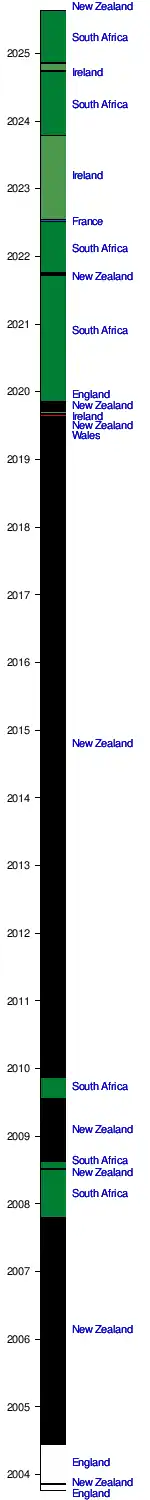England were ranked as No. 1 when the rankings were introduced in late 2003. New Zealand hold the record for the longest run as the No. 1 World Ranked team, spending just less than three months short of 10 years uninterrupted atop the rankings. South Africa currently top the world rankings. Not shown on the table, but the other nations to have been ranked No. 1, are Wales, spending two weeks in the top spot in 2019, before relinquishing the No. 1 spot to New Zealand, and France who held No. 1 for a week in 2022. Tenures are correct as of the last ranking update on 27 January 2025: