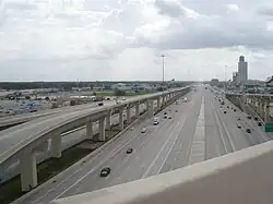 From the western suburb of Katy to downtown, I-10 is known as the Katy Freeway in Houston. This section was widened in 2008 to as many as 26 total lanes, counting the six lanes of the access (frontage/feeder) road, which feature traffic signals, and driveway access and are not limited-access and therefore not technically part of the freeway itself but are directly adjacent.[9] Between the West Beltway and the West Loop, the Katy Freeway features a basic configuration of 14 lanes, featuring seven lanes each direction. This cross-section swells with auxiliary lanes, ramp lanes, and the inclusion of the frontage access roads, although those lanes are controlled by traffic signals. Including auxiliary lanes, ramp lanes, and the access frontage roads, the minimum lane count is 22 total lanes. In this section, the width is 24 lanes at multiple locations and up to 26 lanes east of Gessner Road (12 main lanes, eight lanes of access roads, and six mid-freeway HOT/HOV lanes). From the Fort Bend County line to I-610, there is a minimum of four main lanes in each direction.[10] The maximum number of undivided lanes at any point on the freeway is nine in the eastbound direction approaching Antoine Drive (though this includes one exit-only lane); this is one of the widest sections of undivided highway in a single direction in the world.[11] The widest right-of-way, 556 ft (169 m), occurs at the Katy Freeway's intersection with Bunker Hill;[12] at that point, the expansion plans called for six main lanes plus two toll lanes in each direction along with 10 lanes on the feeder/frontage roads. While this section still features 14 through continuous lanes through the Bunker Hill interchange, when auxiliary lanes, ramp lanes, and the frontage access roads are included, the actual striping after construction delineates 29 lanes, including all 26 of the planned lanes plus an additional lane in each direction to enter or exit the toll lanes and one more turn lane on the eastbound feeder road.[13] Between Texas State Highway 6 and Interstate 610, I-10 HOV/HOT lanes are known as Katy Managed Lanes, or simply known as Katy Tollway.