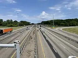 Groundbreaking for the interchange took place on July 30, 2013, with Governor Tom Corbett in attendance.[16] Construction of the first stage of the interchange, consisting only of the two high-speed flyovers carrying I-95, began in late 2014.[17] Control cities along I-95 were updated in early 2018 in preparation for the opening of the main flyovers. From as far south as I-676/US 30 in Center City, the previous northbound control city of Trenton was replaced with New York. This continues eastward as I-95's northbound control city into New Jersey. Trenton remains the control city of eastbound I-295 (former northbound I-95) until US 1, after which it becomes Princeton. In preparation for completion of this stage, I-95 was truncated to the Taylorsville Road interchange in Lower Makefield Township in March 2018 and then truncated to the site of the interchange construction in July of the same year, with I-295 extended to replace I-95.[18] On September 22, 2018, the flyovers opened. Signs were updated during a brief early-morning closure of the turnpike, marking the truncation of I-276 to the new interchange, removing most of the signage for the Pennsylvania Turnpike, and the extension of I-95 eastward into New Jersey, forming a continuous posted route between Miami, Florida, and the Canada–United States border at Houlton, Maine.[19] The completion of this interchange also provided a direct freeway connection between Philadelphia and New York City.