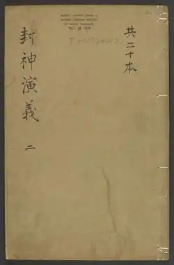 The Investiture of the Gods, also known by its Chinese titles Fengshen Yanyi (Chinese: 封神演義; pinyin: Fēngshén Yǎnyì; Wade–Giles: Fêng1-shên2 Yan3-yi4; Jyutping: Fung1 San4 Jin2 Ji6) and Fengshen Bang (封神榜),[note 1] is a 16th-century Chinese novel and one of the major vernacular Chinese works in the gods and demons (shenmo) genre written during the Ming dynasty (1368–1644).[2] Consisting of 100 chapters, it was first published in book form between 1567 and 1619.[2] Another source claims it was published in a finalized edition in 1605.[3] The work combines elements of history, folklore, mythology, legends and fantasy.[4]