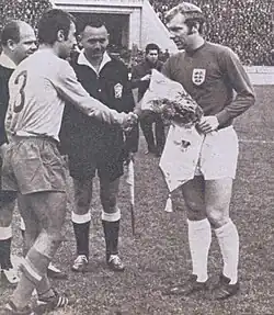 Barbu played seven games at international level for Romania, making his debut in a friendly which took place on 17 November 1966, as coach Ilie Oană used him all the minutes in the 4–3 home victory against Poland.[15][16][17] His following two games were two losses to Italy in the Euro 1968 qualifiers.[15] He captained Romania for the first time in a friendly that ended in a 1–1 draw against Austria.[15] In his last match for the national team, which was also a friendly, he was again captain in the 0–0 draw against the 1966 World Cup winners, England, exchanging pennants with Bobby Moore before the match.[15][4][18]