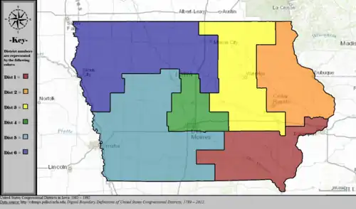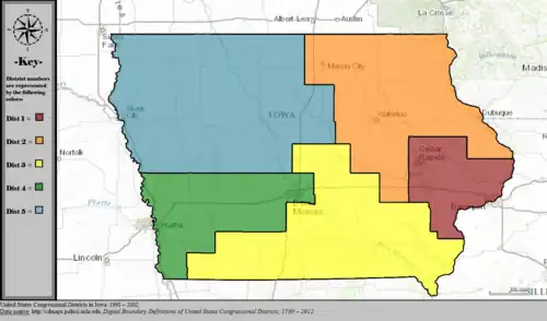 Table of United States congressional district boundary maps in the State of Iowa, presented chronologically.[3] All redistricting events that took place in Iowa between 1973 and 2013 are shown.