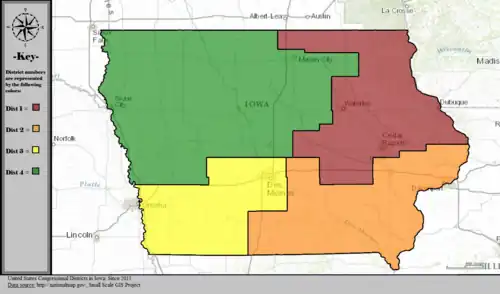 Iowa is divided into four congressional districts, each represented by a member of the United States House of Representatives. The state's congressional map is roughly divided by quadrants in the northeast, northwest, southeast, and southwest sections of Iowa.