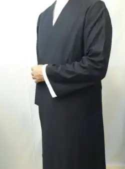 The Labbādeh (Persian: لَبّاده) is a type of qabā, historically signifying a higher social rank and often associated with horsemen and shepherds. It is considered a prestigious garment that, unlike more common outerwear, conveys elegance and formality. A refined variant of the labbādeh is the Tabbādeh (Persian: تَبَاده), which is designed to be worn over the qabā.[44] The tabbādeh features a circular collar that completely covers the shoulders and chest, creating a layered and sophisticated appearance. Unlike the qabā, which is more comfortable for daily use, the tabbādeh is tighter and requires careful tailoring, making it less practical but visually more striking. It has long sleeves and two vertical slits that serve as hidden pockets, but the lower part lacks buttons and is made as a single piece of fabric.[45] Today, the tabbādeh is primarily worn by Shi’a clerics, religious students in seminaries, and some political elites, serving as a marker of scholarly and spiritual prestige. In cities like Qom, Najaf, Mashhad, and Isfahan, specialized tailors craft these garments, often requiring high skill due to the garment’s intricate structure.[46]