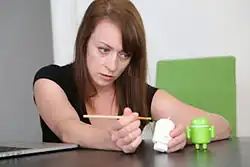 Irina Blok (born c. 1977) is a graphic designer and an artist. She is best known for the creation of the Android logo including its green robot icon.[1] She was born and raised in Saint Petersburg, Russia, until she and her parents moved to Silicon Valley, a region in Northern California, when she was 18 years old. She comes from a family of engineers, her parents and her grandparents were all engineers, making her their only graphic designer.[2]