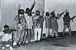 In February 1976 a statement was issued declaring that the "National Liberation Army" and "People's Liberation Army" (the nom de guerre employed by the INLA during its feud with the Official IRA) had merged to form a single organisation.[34] Reportedly the People's Liberation Army name was chosen without the oversight of the group's Dublin-based leadership, although apparently throughout 1976 the INLA in Derry was still known to its own members and outsiders as the PLA.[35] In July 1976 the PLA in Derry issued a lengthy statement concurring with a recent IRSP statement on recovering from the November split, and stressed the necessity of the PLA as a socialist alternative to the Provisional IRA in the fight against British imperialism.[36] Journalists had already deduced the Irish National Liberation Army was the military wing of the IRSP following their November 1975 release, although the IRSP would only admit that they had accepted "protection" from "armed groups" in their feud with the Official IRA.[32]