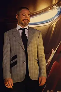 Favreau planned to cast a newcomer in the title role, as "those movies don't require an expensive star; Iron Man's the star, the superhero is the star. The success of X-Men and Spider-Man without being star-driven pieces reassures [executives] that the film does have an upside commercially."[68] Those considered for the role included Jim Caviezel, Timothy Olyphant, Sam Rockwell, and Clive Owen.[21][69] Rockwell was approached and was interested,[70] but Favreau then met with Robert Downey Jr., who he was convinced was the right actor for the role.[21] Favreau chose Downey, a fan of the comic, because he felt the actor's past made him an appropriate choice for the part, explaining: "The best and worst moments of Robert's life have been in the public eye. He had to find an inner balance to overcome obstacles that went far beyond his career. That's Tony Stark."[9] Favreau faced opposition from Marvel Entertainment executives in casting Downey,[21][71] but would not take no for an answer, saying: "It was my job as a director to show that it was the best choice creatively ... everybody knew he was talented [and] certainly by studying the Iron Man role and developing that script I realized that the character seemed to line-up with Robert in all the good and bad ways."[71] Casting director Sarah Halley Finn suggested Downey create an audition tape to help persuade them. The executives were still not convinced, despite Favreau and Feige recommending Downey for the role, which resulted in Favreau leaking to the press that Downey was in talks; the positive reaction and enthusiasm to this story helped convince the executives,[21] and Downey was cast in September 2006.[72] Rockwell would later portray Justin Hammer in Iron Man 2 (2010).[70] Downey earned $500,000 for the role.[73] While preparing for filming, Favreau and Downey were given a tour of SpaceX by Elon Musk. Downey said, "Elon was someone Tony probably hung out with and partied with, or more likely they went on some weird jungle trek together to drink concoctions with the shamans."[74]
