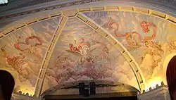 The proscenium mural of the theatre displays a stunning three-piece canvas painting by artist William Hasenberg. This was painted during the finishing stages of construction in 1927 to complete the theatre's grand-scale look. During a renovation in 1973, the mural and surrounding ceiling were painted with dark blue and white paint. The repainting was thought to have destroyed the mural until restoration efforts by muralist David Strickland proved successful in removing the paint without destroying the underlying mural. The 1994 restoration project restored the mural to its original look. The mural, now perfectly restored, catches the eye of every guest who steps into the auditorium.