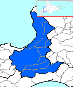 Ishikari Subprefecture (石狩振興局, Ishikari-shinkō-kyoku) is a subprefecture of Hokkaido Prefecture, Japan, located in the western part of the island. The subprefecture covers 3,539.86 square kilometres (1,366.75 sq mi) and on July 31, 2023 had a population of 2,379,802.[1] The subprefecture takes its name from the Ishikari River, the third longest in Japan, which flows through western Hokkaido and empties into the Sea of Japan in the city of Ishikari. There are 6 cities, three towns, and one village under its jurisdiction. Sapporo is both the capital of Hokkaido Prefecture and Ishikari Subprefecture. Shikotsu-Toya National Park is located in the southern part of the subprefecture, and Shokanbetsu-Teuri-Yagishiri Quasi-National Park in the north.[2]