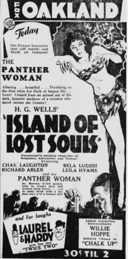 A critic writing for New York Herald-Tribune said Island of Lost Souls has "the quality of a hangover"; the reviewer praised Laughton and described Burke's performance as possessing "a certain bewildered, sad-eyed quality that manages to be rather touching".[38] B.M. of the Brooklyn Times-Union wrote the film might suffer in comparison to films like Frankenstein, Doctor X, and White Zombie.[49] The reviewer praised the performances of Burke and Laughton, and said the film will "even provoke some of the more serious to speculative scientific thinking".[49] Martin Dickstein of The Brooklyn Daily Eagle recommended Island of Lost Souls to horror fans, stating it is "as horrifying as anything the screens have offered in months", and calling it "immensely thrilling, in a few spots, you will probably find it a terrible bore in others" and concluding, "personally, it left us cold".[50] "Waly." of Variety reviewed the film at the Rialto on January 11, 1933, stating it has good imagery and that "there are undoubtedly some horror sequences which are unrivaled"; the reviewer found the plot poor, comparing it to cheap adventure magazine stories and "grammar school mysteries".[51] The reviewer also praised Laughton's performance but said Burke is "too much like a girl" than a panther-human hybrid.[51] Mordaunt Hall reviewed the film for The New York Times, saying that "the attempt to horrify is not accomplished with any marked degree of subtlety, there is no denying that some of the scenes are ingeniously fashioned and are, therefore, interesting". Hall praised Laughton as "the best actor in the tale" whose performance greatly enhances the film.[52]