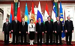 On 6 September, Russian President Vladimir Putin arrived in Samarkand to pay tribute to Karimov. Kneeling in front of Karimov's grave, he laid a bouquet of red roses. In addition, Putin met with the relatives of the deceased and expressed condolences to them.[93] On 12 September, Kazakh President Nursultan Nazarbayev also visited Karimov's burial site. He laid a bouquet of red roses, prayed beside his grave, and met Karimov's wife.[94][95] On 6 October, Belarusian President Alexander Lukashenko paid a working visit to Uzbekistan. He laid roses to Karimov's grave, met his wife, and held talks with Interim President Mirziyoyev.[96] Turkish Foreign Minister Mevlüt Çavuşoğlu laid a wreath at Karimov's grave on 20 October.[97] Other high-ranking officials of Azerbaijan, India, the United Arab Emirates, as well as Under Secretary for Political Affairs of the United States Thomas Shannon also paid tribute to Karimov.[98][99] On 1 November, a square in the Yakimanka district in the center of Moscow was named after Islam Karimov.[100] Chinese Foreign Minister Wang Yi paid tribute to Karimov in Samarkand on 12 November.[101] President of Turkey Recep Tayyip Erdoğan visited the grave of Islam Karimov on 18 November, as a part of his official visit to Uzbekistan.[102] Kyrgyz President Almazbek Atambayev paid tribute to Karimov on 24 December, during his working visit to Uzbekistan.[103] On 7 March 2017, Presidents of Uzbekistan and Turkmenistan Shavkat Mirziyoyev and Gurbanguly Berdimuhamedow opened the first monument of Islam Karimov in the Turkmen city of Türkmenabat. On 10 June, during his official visit to Uzbekistan, UN Secretary General António Guterres visited Karimov's grave.