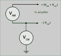 All signal sources are a composite of two major components. The normal mode component (VNM) represents the signal of interest and is the voltage that is applied directly across the inputs of the amplifier. The common mode component (VCM) represents the difference in potential between the low side of the normal mode component and the ground of the amplifier that is used to measure the signal of interest (the normal mode voltage).