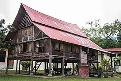 The Istana Lama (Negeri Sembilan Malay: Istano Lamo, Jawi: ايستان لاما) is regarded as the icon of Seri Menanti and one of the famous landmarks in Kuala Pilah District. It is the largest palace in Malaysia that is built entirely out of timber. It is made in part of chengal wood (Neobalanocarpus) and iron wood or belian wood (Eusideroxylon zwageri) and held together using only wooden pegs. The palace took six years to build and was completed in 1908 at a cost of $45,000.00 at that time. The design has subtle hints of Minangkabau architecture, has five levels rising to a height of sixty seven feet or approximately twenty meters high and has ninety nine columns to support the main structure. Four of the main columns of sixty seven feet are the Chengal timber that came from Bukit Pergai, Jelebu and is the central feature of the structure which holds up the apex of the palace, namely the Treasury Room. The Istana Lama was a replacement for Istana Pulih which was burned down by British soldiers. The drawings and plans for Istana Lama was detailed by Mr. Woodford (Public Works Department) based on the designs provided by two local craftsmen, Kahar and Taib. This palace was used until 1932 after which the Yang Di-Pertuan Besar moved to Istana Besar.