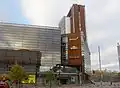 The principal material of the facade is weathering steel, acting as a link between the red brick architecture of the old industrial buildings in the area and the high tech buildings. Reasons for selecting the material include its ecological properties, such as full recyclability. The outer steel surfaces consists of weathering steel cassettes 1.5 millimetres thick and the inner surfaces of small-waved warped sheets 1.0 millimetres thick. Weathering steel is used on the grill, shaped steel, coping, attachment of the cassettes and partly in the supporting pillars. The facade of the tower also uses acid-proof steel intended to lighten the appearance of the facade.[2]: 92