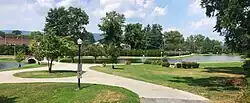 By the 1980s, the park was later restored to its mid-century grandeur.[3] The lake is surrounded by antique-style streetlights, textured walkways, and formal gardens maintained in the Italian Renaissance-style. Features of the park include a Japanese-style bridge representing harmony between nature and man and a stage for public events, and the Dauphin County Veteran's Memorial Obelisk formerly placed on State Street in front of the Pennsylvania State Capitol. The lake also features a classical-style fountain formerly owned by Milton Hershey entitled The Dance of Eternal Spring, designed by Italian sculptor Giuseppe Donato with three dancing nymphs representing art, music, and dance and modeled after local model Amanda Straw.[4] Outdoor concerts, plays, town-hall style events, and pop-up markets are held at the park during the summer months.[3]