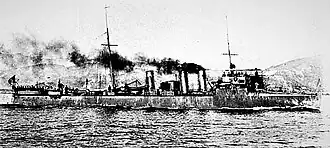 On 23 February 1916, under the command of Capitano di frgatta (Frigate Captain) Del Buono, Bersagliere joined Corazziere and Garibaldino in escorting 12 steamers and two tugs to Durrës (known to the Italians as Durazzo) on the coast of Albania.[9] On 24 February, Bersagliere, the auxiliary cruisers Città di Catania and Città di Siracusa, and the destroyers Ardito and Irrequieto began to bombard advancing Austro-Hungarian troops in Albania who were about to occupy Durrës. In the following days they also bombarded Austro-Hungarian artillery positions on the mountain Sasso Bianco in the Dolomites near Durrës.[8]