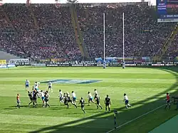 Before joining the Six Nations in 2000 Italy did not have a set stadium and played their home matches in various stadiums around Italy. From 2000 to 2011 Italy played all of their home Six Nations matches at the Stadio Flaminio in Rome. The Italian Rugby Federation (FIR) announced, in January 2010, that the stadium would undergo an expansion, that will increase its capacity to 42,000.[39] Continued delays to the start of construction meant that the revamp could not be completed in time for the 2012 Six Nations so all of Italy's home Six Nations games were moved to the Stadio Olimpico, also in Rome.[40] The expansion of the Stadio Flaminio was originally promised to be complete by 2014. It was planned that upon completion of the renovation, the team would move back to the Stadio Flaminio,[41] however little was achieved and as of September 2016 the stadium was still in a state of abandoned disrepair.[42] More Italians are attending rugby union games and whereas before most of the fans at the Stadio Flaminio were away fans. Since moving to the Stadio Olimpico attendances have increased by huge numbers.[43] Italy has drawn large crowds since 2008, particularly for Six Nations matches and for matches against New Zealand: