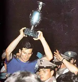 Under the initial guide of Fulvio Bernardini and later that of head coach Enzo Bearzot, a new generation of Italian players came to the international stage in the second half of the 1970s. At the 1978 World Cup, Italy was the only team in the tournament to beat the eventual champions and host team Argentina, and the Azzurri made it to the third-place final, where they were defeated by Brazil 2–1. In the second round group stage match against the Netherlands, which prevented Italy from reaching the final, Italian goalkeeper Dino Zoff was beaten by a long-distance shot from Arie Haan, and Zoff was criticised for the defeat.[23] Italy hosted the 1980 European Championship, the first edition to be held between eight teams instead of four,[24] automatically qualifying for the finals as hosts. After two draws with Spain and Belgium and a narrow 1–0 win over England, Italy were beaten by Czechoslovakia in the third-place match on penalties 9–8 after Fulvio Collovati missed his kick.[25][26]