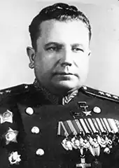 Ivan Tikhonovich Grishin (Russian: Иван Тихонович Гришин; 16 December 1901 – 20 June 1951) was a Soviet Army Colonel general and Hero of the Soviet Union. Grishin enlisted in the Red Army during the Russian Civil War and fought against the Tambov Rebellion. He became an officer and graduated from the Frunze Military Academy in 1936. In October 1940, he became the commander of the 137th Rifle Division, which he led through the World War II battles of Smolensk and Moscow. Grishin became 50th Army chief of staff and in April 1943 transferred to the same position in the 11th Guards Army. Soon after, he became 49th Army commander and led the army through the Smolensk Operation, Operation Bagration, the East Prussian Offensive and the Berlin Offensive at the end of the war. Postwar, Grishin commanded the 6th Guards Army. In 1946, he became the head of combat training for the Ground Forces. Grishin died in 1951 in Moscow.