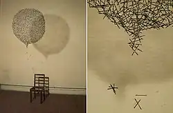 Shown in the group exhibition entitled Wo-Man at the Old Ladies House in Macau in 2001,[19] Room of Memories (2001) is an installation work consisted of a giant thought bubble composed of hundreds of old-fashioned women's hairpins suspended above a broken chair in a comic-strip narrative.[20]