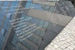 The name of Izrael Kanał is shown on the commemorative plaque placed at Monument to the Evacuation of the Warsaw Ghetto Fighters at 51 Prosta Street in Warsaw.