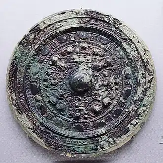 The Izumi Koganezuka Kofun is a zenpō-kōen-fun (前方後円墳), which is shaped like a keyhole, having one square end and one circular end, when viewed from above. It is located at the northwestern end of Shintayama hill, surrounded paddy fields, but the location is also close to the ancient provincial capital of former Izumi Province. The tumulus has a total length of about 94 meters. The presence of a kofun at this location has been known since antiquity, but in November 1945, a 17-year-old student noticed that the tumulus was severely damaged and convinced local authorities that a rescue archaeology excavation be performed. At that time, a leather-lacquered shield with copper decorations, iron swords and other metal artifacts were discovered. In 1950 to 1951, further excavation of the posterior circular portion by the Osaka Prefectural Board of Education and the Japanese Archaeological Association found the burial chamber within which three clay-covered wooden caskets were found side by side. The central casket had the remains of a woman, and she was flanked on either side with the remains of two men. Within and surrounding these coffins were a large quantity of grave goods, including Shinju-kyo mirrors, magatama beads and other jewelry, fragments of armor and a helm, iron swords, spears and other weapons, and other artifacts. The inscription of one of the mirror gave the reign date of Keisho 3, which corresponds to 238 AD. This drew great attention by historians, as per the Chinese chronicle Wei zhi (魏志 "Records of Wei"), which is part of the Records of the Three Kingdoms (三國志), in the year 239 AD Emperor Cao Rui sent "one hundred bronze mirrors" to Queen Himiko of Wa,[3] and it was possible that this was one of these mirrors. These excavated items are now are in the possession of the Tokyo National Museum.[4]