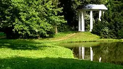 In 1938, a monument to Stanisław Moniuszko was erected on the main axis of the park, unfortunately, destroyed by the Germans a year later. During World War II, the Germans closed the park for Poles and Jews,[3] and most of the conifers that remained from the city forests were cut down, the perennial garden was also liquidated, and tennis courts were built in its place (currently the Municipal Tennis Club). During the war, the bottom of the pond was also destroyed, which was not rebuilt until 1957.