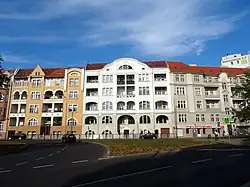 In the middle was planted flowerbeds, shrubs and trees. In 1926, coniferous and deciduous trees were put.[4] Between 1905 and 1911, a frontage of five-story apartment buildings have been built, following Art Nouveau and Historicism styles.